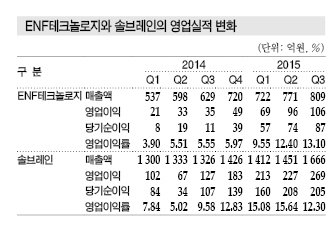 ENF테크놀로지는 영업이익이 2014년 상반기 55억원에서 2015년 상반기 166억원으로 약 3배 증가했으며, 당기순이익은 27억원에서 137억원으로 4.8배 폭증했다.