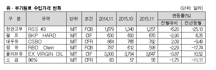 천연고무 수입가격이 공급 증가 등으로 하락세를 나타냈다.