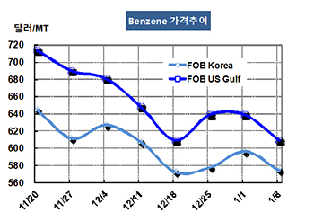 벤젠 가격은 1월8일 FOB Korea 톤당 574달러로 22달러 하락했고 FOB SE Asia는 톤당 554달러를 형성했다. CFR Taiwan도 590달러로 떨어졌다.