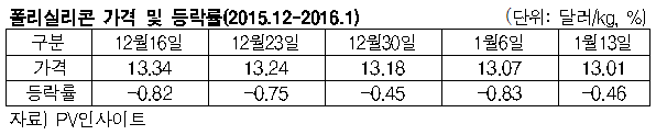폴리실리콘(Polysilicon)은 2015년 1월 19달러대에서 1년 만에 30% 가까이 떨어진 것으로 나타났다.