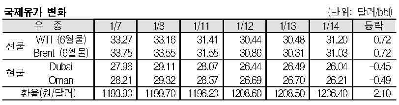 화학뉴스 2016.01.15 1월14일 국제유가는 저가 매수세 유입 및 주요국의 증시 상승 등으로 상승했다.