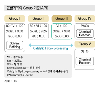 윤활기유는 점도지수, 포화도 및 황 함량에 따라 GroupⅠ, GroupⅡ, GroupⅢ, GroupⅣ, GroupⅤ로 구분되고 있으며 높은 Group으로 갈수록 점성과 포화도가 높고 황 함량이 적은 고급 그레이드 윤활기유로 평가되고 있다.