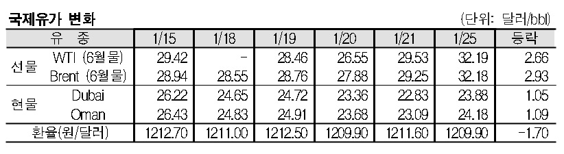 1월22일 국제유가는 저가 매수세 유입 지속, 난방유 수요 증가, 주요국의 증시 상승, 미국 원유 시추리그 수의 감소 등으로 상승했다.