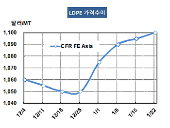 LDPE(Low-Density Polyethylene)는 원료가격 하락에도 상승세를 지속했다.
