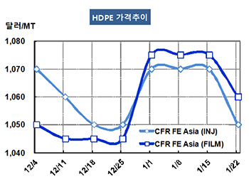 HDPE(High-Density Polyethylene)는 보합세를 마감하고 하락했다.