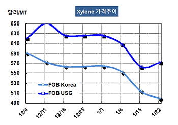 M-X 가격은 1월22일 FOB Korea 톤당 498달러로 15달러 하락했고 CFR SE Asia는 565달러로 15달러 떨어졌다. CFR China는 534달러로 16달러 하락했다.