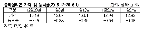 표, 그래프: < 폴리실리콘 가격 및 등락률(2015.12-2016.1) > <화학저널 2016/01/28> |