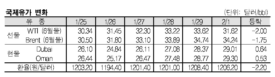 2월1일 국제유가는 OPEC(석유수출국기구)과 비OPEC의 감산 공조 기대감이 줄어들고 주요국 경기지표가 부진한 영향 등으로 폭락했다. 2월1일 국제유가는 OPEC과 비OPEC의 감산 공조 기대감이 줄어듦에 따라 하락했다. 표, 그래프: <국제유가 동향> <화학저널 2016/02/02> |