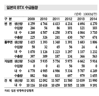 일본은 BTX 수출이 2013년 211만톤에서 2014년 289만톤으로 확대됐고 2015년에는 355만톤에 달할 것으로 예측되고 있다.