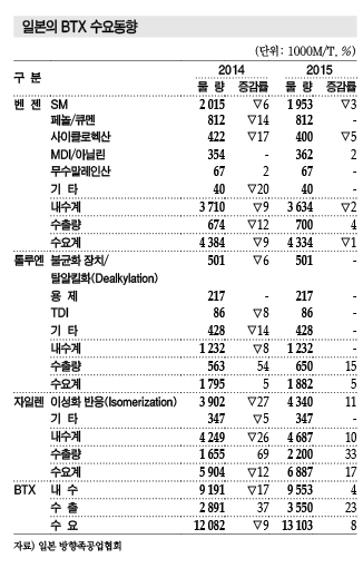일본 방향족공업협회에 따르면, 일본은 2014년 BTX 수요가 1208만톤으로 9% 감소한 것으로 나타났다. 2013년에는 탄탄한 내수 뿐만 아니라 북미의 아로마틱(Aromatics) 생산 감소에 따라 수출이 70% 가까이 늘어 전체 수요가 사상 최대치를 기록했고, 2014년 수요가 1304만톤으로 1% 감소할 것으로 예상됐으나 감소규모가 크게 미치지 못했다.