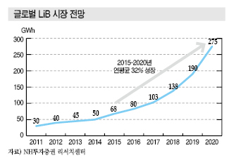 이에 따라 전기자동차용 리튬이온전지 시장도 2015년 9GWh에서 2020년 159GWh로 연평균 76%, 시장규모는 2015년 230억달러에서 2020년 800억달러로 연평균 28% 성장할 것으로 예측되고 있다.