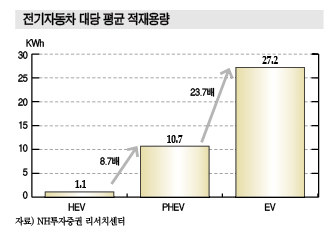 2차전지 적재용량은 PHEV 10.7kwh, EV 27.2kwh 정도로 파악되며 EV 1대 판매에 따른 리튬이온전지 수요는 대략 PHEV 20대, HEV 50대와 맞먹는 것으로 추정된다.