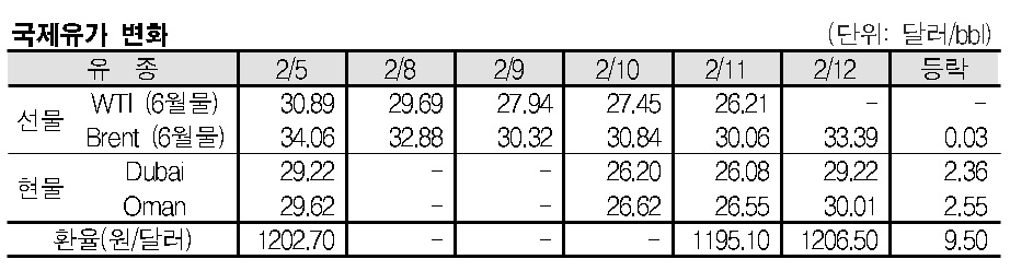 2월15일 국제유가는 주요 산유국의 감산 공조 기대감 증가, 아시아 및 유럽 증시 강세 등으로 상승했다. 2월15일 국제유가는 주요 산유국의 감산 공조 기대감 증가 등으로 상승했다. 표, 그래프: <국제유가 변화> <화학저널 2016/02/16> |