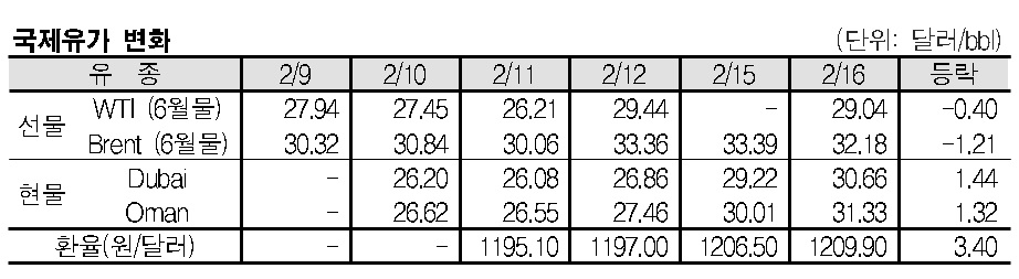 2월16일 국제유가는 주요 산유국 생산량 동결 합의에 대한 실망감, 미국 쿠싱지역 원유 재고 증가 추정, 미국 달러화 강세 등으로 하락했다. 2월16일 국제유가는 주요 산유국 생산량 동결 합의에 대한 실망감 등으로 하락했다. 표, 그래프: <국제유가 변화> <화학저널 2016/02/17> |