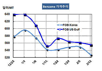 벤젠 가격은 2월12일 FOB Korea 톤당 527달러로 22달러 급락했고 FOB SE Asia 역시 510달러로 19달러 떨어졌다.