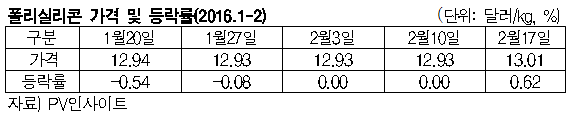 표, 그래프: < 폴리실리콘 가격 및 등락률(2016.1-2) > <화학저널 2016/02/18> |