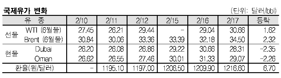 2월17일 국제유가는 이란의 주요 산유국 생산량 동결지지 발언, 주요국 증시 강세 등으로 폭등했다. 2월17일 국제유가는 이란의 주요 산유국 생산량 동결지지 발언 등으로 상승했다. 표, 그래프: <국제유가 변화> <화학저널 2016/02/18> |