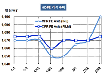 HDPE(High-Density Polyethylene)는 전반적으로 상승세를 나타냈다. 표, 그래프: < HDPE 가격추이 > <화학저널 2016/02/22> |