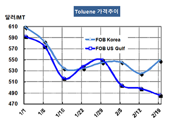 아시아 톨루엔 가격은 2016년 2월19일 기준 FOB Korea 546달러로 22달러 상승했고 브렌트유(Brent)는 배럴당 33.01달러로 0.35달러 하락했다.