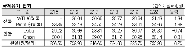 2월22일 국제유가는 국제에너지기구(IEA)의 미국 셰일오일(Shale Oil) 생산 감소 예상, 주요국의 증시 강세, IEA 사무총장의 적정유가 발언 등으로 상승했다. 2월22일 국제유가는 IEA의 미국 셰일오일 생산 감소 예측에 따라 상승했다. 표, 그래프: <국제유가 변화> <화학저널 2016/02/23> |