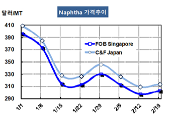 나프타(Naphtha)는 다시 상승세로 돌아섰다. 나프타 가격은 2월19일 CFR Japan 톤당 313달러로 4달러 상승했고 FOB Singapore도 303달러로 6달러 올랐다. 표, 그래프: < Naphtha 가격추이 > <화학저널 2016/02/26> |