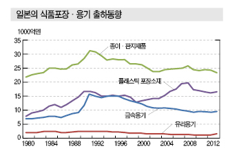 포장·용기 출하액은 1991년을 정점으로 계속 감소하고 있으나 플래스틱은 PET(Polyethylene Terephthalate) 병 수요가 호조를 보임에 따라 2000년부터 증가세를 지속하고 있다.
