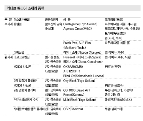 액티브 배리어(Active Barrier) 소재는 산소와 반응해 적극적으로 산소를 흡수하는 소재로 필름 뿐만 아니라 성형용기, 병에 적용되고 있다.