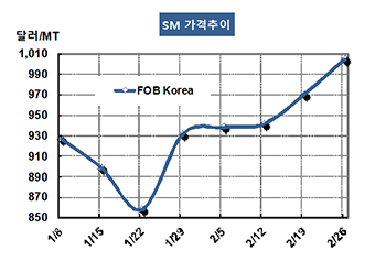 SM(Styrene Monomer)은 급등세를 재연했다. SM 가격은 2월26일 FOB Korea 톤당 1004달러로 34달러 급등했고 CFR SE Asia는 1048달러로 36달러 올랐다. 표, 그래프: < SM 가격추이 > <화학저널 2016/03/02> |