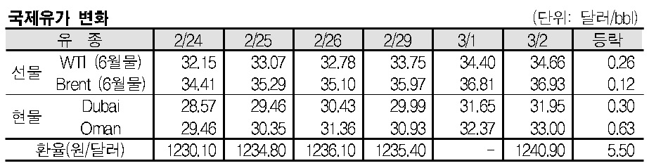3월2일 국제유가는 주요 산유국의 생산동결 이행을 위한 노력 및 미국의 원유 생산 감소 지속 등으로 상승했다. 3월2일 국제유가는 주요 산유국의 생산동결 이행을 위한 노력 등으로 상승했다. 표, 그래프: <국제유가 변화> <화학저널 2016/03/03> |