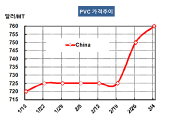 PVC(Polyvinyl Chloride)는 연속적으로 상승세를 나타냈다. PVC 가격은 3월2일 CFR China 톤당 760달러로 10달러 상승했고 CFR SE Asia도 755달러로 10달러 올랐다. 표, 그래프: < PVC 가격추이 > <화학저널 2016/03/07> |