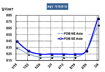 PET(Polyethylene Terephthalate)는 수요가 호조를 나타낸 가운데 원료와 동반 상승했다.