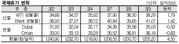3월9일 국제유가는 미국 석유제품 재고 감소, 주요 산유국의 공조에 대한 기대감, 석유기업 재정악화에 따른 석유 생산 감소 등으로 상승했다. 3월9일 국제유가는 미국의 석유제품 재고가 예상보다 큰 폭의 감소를 나타내며 상승했다. 표, 그래프: <국제유가 변화> <화학저널 2016/03/10> |