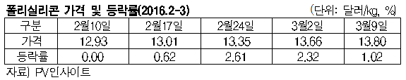 표, 그래프 : <폴리실리콘 가격 및 등락률(2016.2-3)> <화학저널 2016/03/10> |