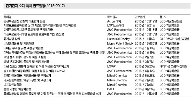 LCD 액정화합물은 Merck를 비롯해 일본기업들의 특허가 2015-2017년 대량 만료돼 동진쎄미켐이 특허를 벗어나 국산화에 성공할 것으로 기대되고 있다.