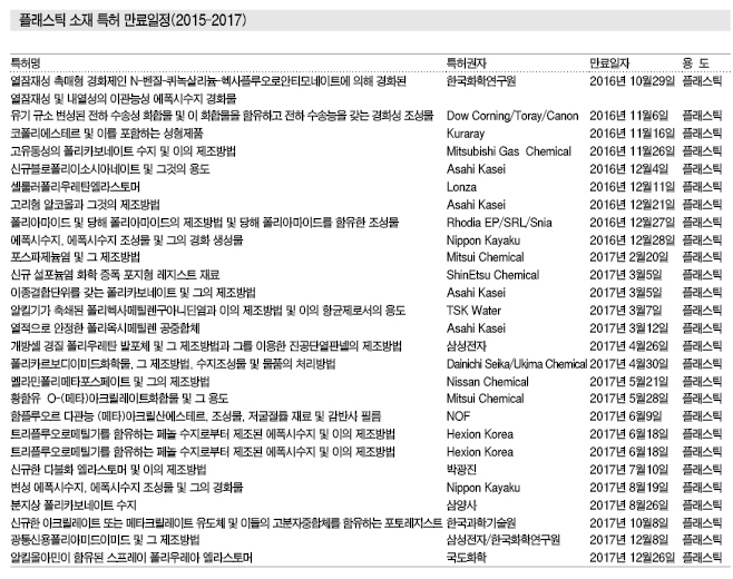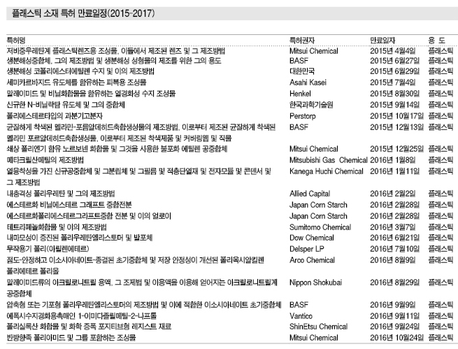 표, 그래프: <전기전자 소재 특허 만료일정(2015-2017)><플래스틱 소재 특허 만료일정(2015-2017)><플래스틱 소재 특허 만료일정(2015-2017)>