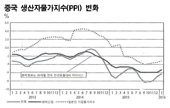 반면, 생산자물가지수(PPI)는 회복세를 나타내고 있으며 특히 화학산업은 2015년 11월부터 2016년 1월까지 3개월 연속으로 하락폭이 축소했다. 다만, 전체적으로는 수요가 부진한 상태가 지속되고 있으며 광범위한 생산제품의 설비과잉이 해소되지 않고 있다.