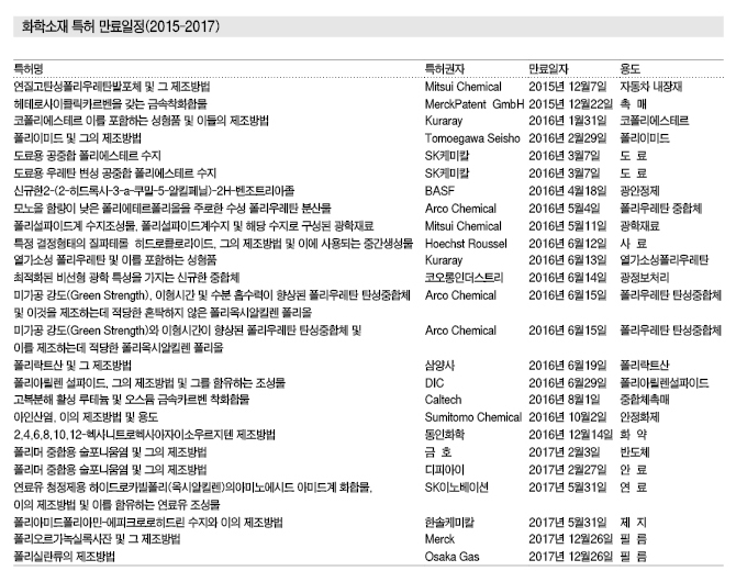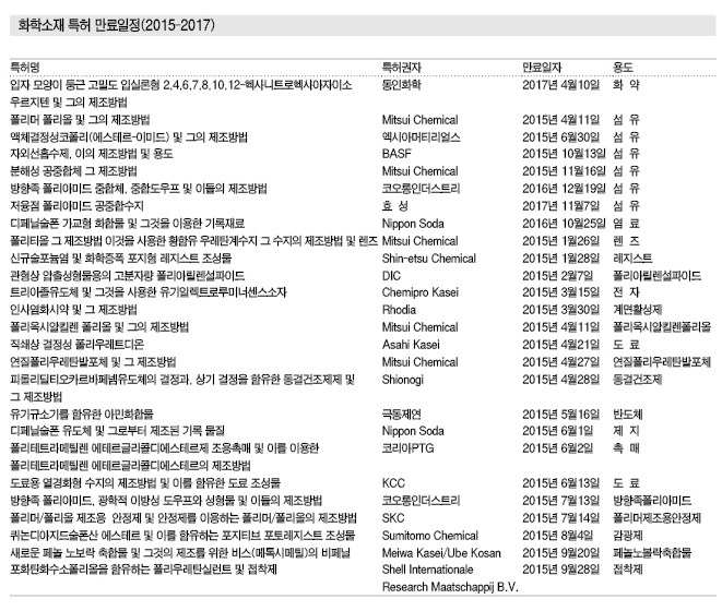 국내시장은 대부분 특허 출원이 2000년 이후에 시작돼 특허 만료가 2020년에 집중되지만 단일 특허로는 화학 소재를 상업화하기 어려워 특허기술을 응용한 신기술을 접목할 필요성이 나타나고 있다. <허웅 기자: hw@chemlocus.com>