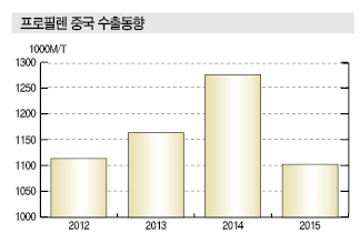 프로필렌 수출은 2015년 110만톤으로 2014년에 비해 20만톤 감소한 것으로 집계되고 있다.