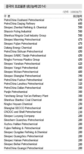중국은 프로필렌 생산능력이 2007년 817만톤에 불과했으나 2013년 2082만톤으로 확대했고, 플랜트 단위당 생산능력도 26만9000톤으로 글로벌 평균 26만톤을 넘어섰다.