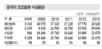 중국은 프로필렌 수요가 생산능력보다 빠르게 증가하고 있으며 2013-2016년 연평균 4.4% 늘어나 몇 년간 수급타이트가 불가피해지고 있다.