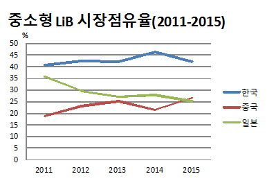 화학뉴스 2016.03.21 중국이 중‧소형 LiB(Lithium-ion Battery) 시장에서 일본을 추월한 가운데 한국과의 시장점유율 격차를 줄여나가고 있다. 표, 그래프 : <중소형 LiB 시장점유율(2011-2015)> |