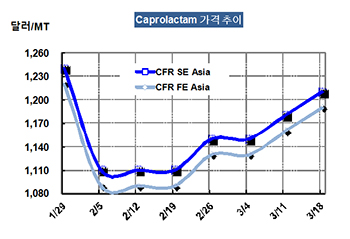 표, 그래프 : < Caprolactam 가격추이 > <화학저널 2016/03/24> |