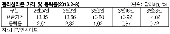 표, 그래프 : <폴리실리콘 가격 및 등락률(2016.2-3)> <화학저널 2016/03/24> |