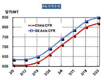 NBA(Nomal Butyl Alcohol) 가격은 원료 프로필렌(Propylene) 강세와 수급타이트가 겹치며 CFR China 톤당 680달러로 40달러 올랐다. ![]() 2-EH(2-Ethyl Hexanol)도 생산기업들의 정기보수가 집중돼 CFR China 800달러, CFR SE Asia 820달러로 각각 40달러씩 올랐다. 한화케미칼은 2016년 3월 3주부터 여수 소재 2-EH 11만톤 및 NBA 5000톤 플랜트를 4주동안, LG화학은 여천 소재 2-EH 24만4000톤 및 NBA 5만톤 플랜트를 4월 중순부터 약 2주 동안 정기보수를 진행한다. 일본 KH NeoChem도 Yokkaichi 소재 NBA 13만톤 및 2-EH 12만톤 플랜트를 3월5일부터 50일동안 정기보수에 들어갈 예정으로 수급타이트가 장기화될 것으로 예상되고 있다. DOP(Dioctyl Phthalate)는 원료인 PA(Phthalic Anhydride) 및 2-EH가 모두 상승해 CFR China 880달러, CFR SE Asia 975달러로 각각 25달러씩 올랐다. 아시아 PA 가격은 CFR China 820달러, CFR SE Asia 850달러로 20달러 상승에 불과했으나 거래가격은 870달러대까지 치솟았던 것으로 파악된다. 중국의 PA 수요는 DOP가 코스트경쟁력이 우수한 PTA(Purified Terephthalic Acid)를 원료로 생산되는 DOTP(Dioctyl Terephthalate)로 전환이 가속화돼 약세를 지속하고 있다. <정현섭 기자> 표, 그래프 : < PA 가격추이 > <화학저널 2016/03/31> |