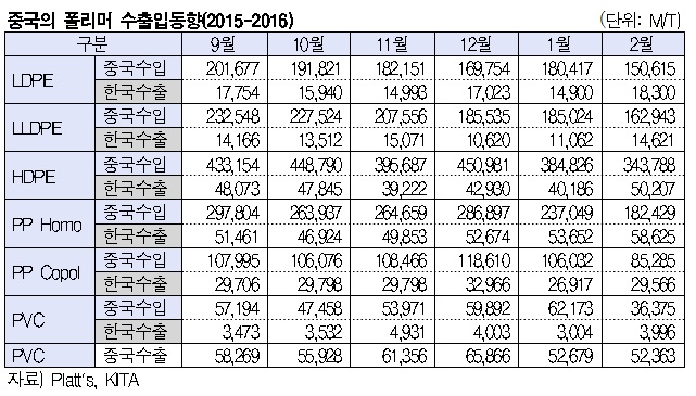 중국 폴리머 시장은 수입이 전반적으로 감소세를 나타냈으나 한국산 수입은 증가했다.