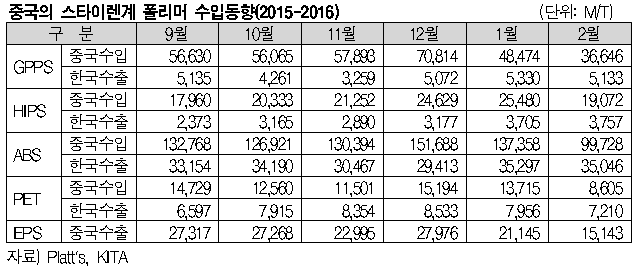 중국은 2016년 스타이렌(Styrene)계 폴리머 수입이 감소세를 계속하고 있다.