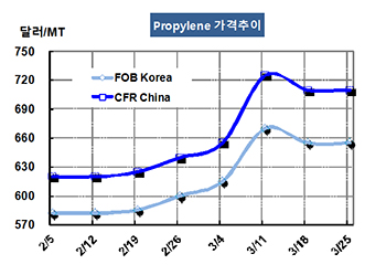 프로필렌(Propylene)은 상승세를 멈추고 하락세로 전환됐다. 프로필렌 가격은 3월25일 FOB Korea 톤당 655달러로 보합세를 형성했고 CFR SE Asia는 700달러로 10달러 하락했다. CFR China는 710달러로 변동이 없었다. 표, 그래프 : < Propylene 가격추이 > <화학저널 2016/03/29> |