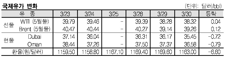 3월30일 국제유가는 미국의 휘발유 재고 감소 및 원유 생산량 감소, 미국 달러화 약세, 주요국 증시 상승 등으로 상승했다. 3월30일 국제유가는 미국 휘발유 재고 감소로 상승했다. 표, 그래프: <국제유가 변화> <화학저널 2016/03/31> |