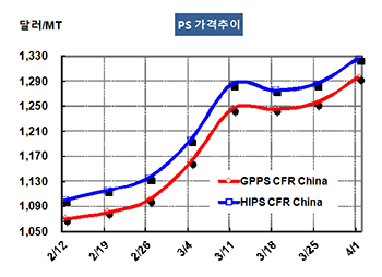 GPPS, CFR China 1295달러로 40달러 올라 … HIPS 1325달러 형성
