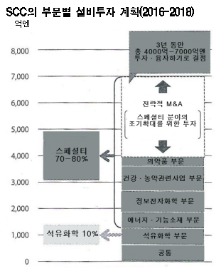 표, 그래프: <SCC의 부문별 설비투자 계획(2016-2018)> <화학저널 2016/04/08> |